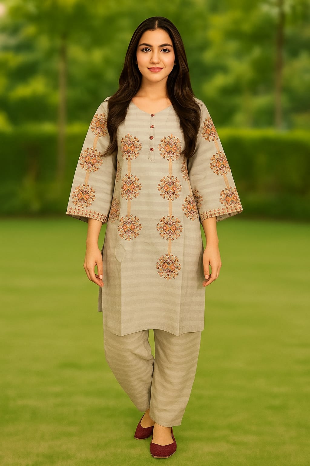 Upgrade your wardrobe with this stunning 2-piece embroidered dress, crafted in a soft beige shade and beautifully adorned with maroon and multi-color thread embroidery. The intricate floral patterns on the front and sleeves give it a traditional yet modern touch.